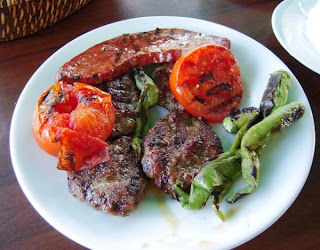 Öncelikle derin bir kabın içinde su ve soğan suyu hariç bütün malzemeleri güzelce yoğurun. Soğan suyunu ve suyu yavaş yavaş ilave ederek iyice en az 10 dakika kadar yoğurup streç filmle ağzını kapatarak dolaba kaldırın bir iki saat dinlensin. Dinlenen kıymadan minik parçalar koparıp elinizi hafif yağlayarak ovuç içinizde incecik olacak şekilde yuvarlak köfteler yapın. Önceden ısıtılmış kızgın teflon tavada yağsız önlü arkalı pişirin ama kurutmayın ince olduğu için çabuk pişiyor. Aynı tavanın içerisinde domates ve biberleri de pişirin. Sosu için sos tavasının içerisine tereyağı alıp eritin salçayı ilave edip eritin, toz biber ekleyip güzelce kavurun, suyunu ilave edip bir taşım kaynatın. En son olarak bir servis tabağına köftelerinizi kızarmış domates ve biberleri istediğiniz şekilde yerleştirin. Üzerine salçalı sosdan gezdirip sıcak sıcak servis edilir.